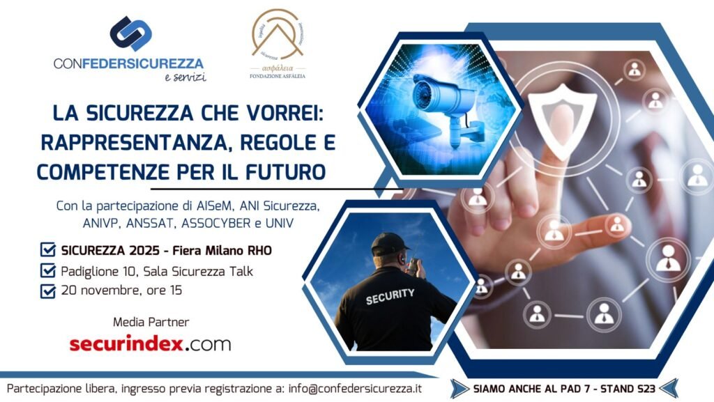 Il Presidente Vincenzo Acunzo a “La Sicurezza che vorrei: rappresentanza, regole e competenze per il futuro”, di ConFederSicurezza e Servizi e Fondazione Asfàelia In occasione della prossima edizione di Fiera SICUREZZA, in programma a Rho (Milano) dal 19 al 21 novembre 2025, ConFederSicurezza e Servizi, aderente a Confcommercio-Imprese per l’Italia, in collaborazione con la Fondazione Asfàleia, organizza un Convegno dal titolo “La Sicurezza […]